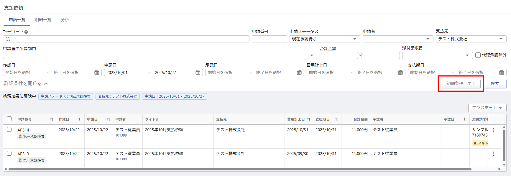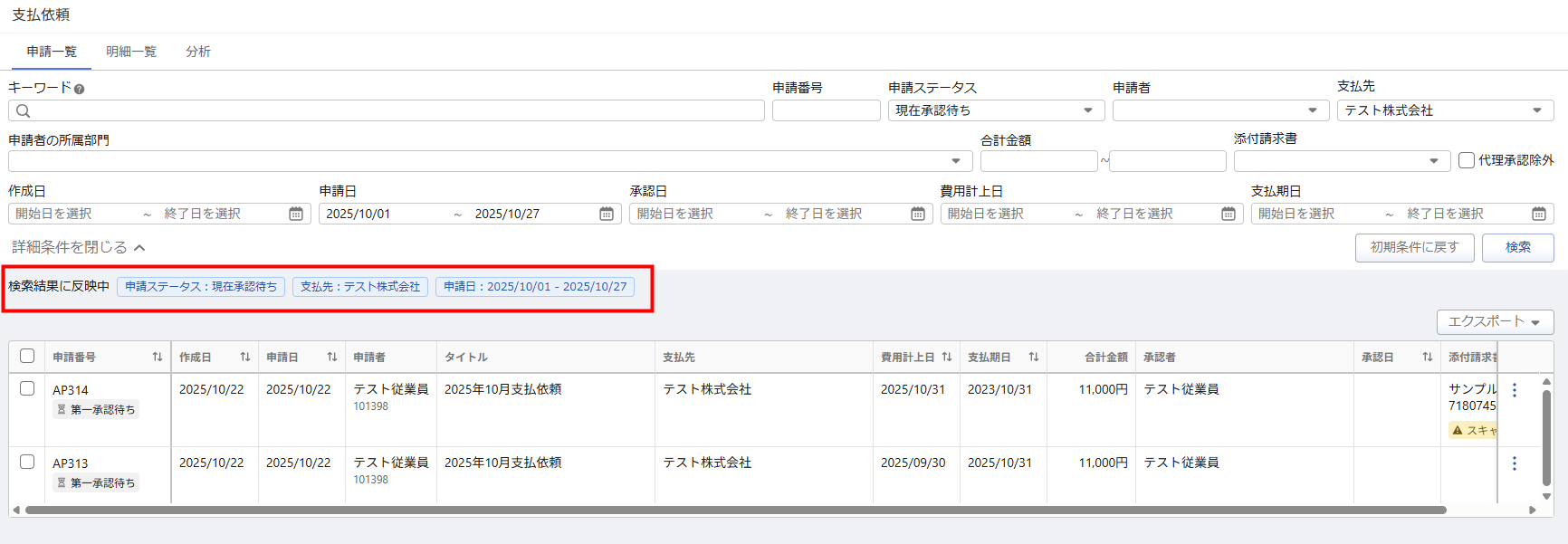 検索条件を指定して申請を検索すると、「検索結果に反映中」の横に設定中の条件が表示されるようになります。
