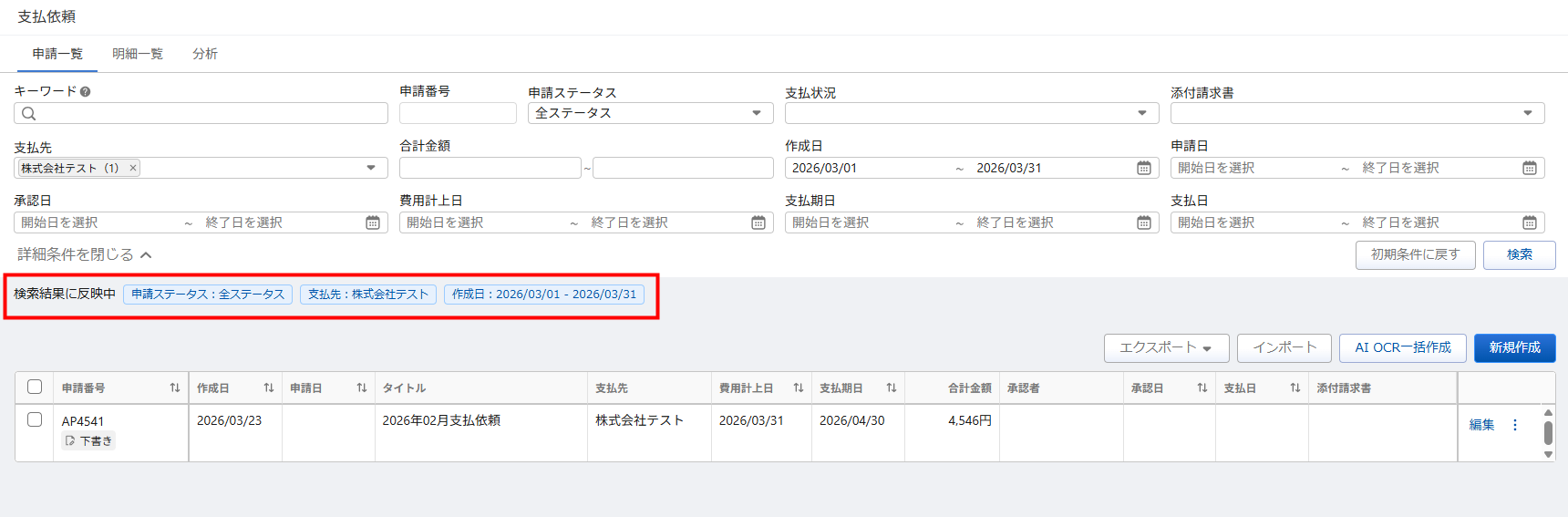 検索条件を指定して申請を検索すると、「検索結果に反映中」の横に設定中の条件が表示されるようになります。