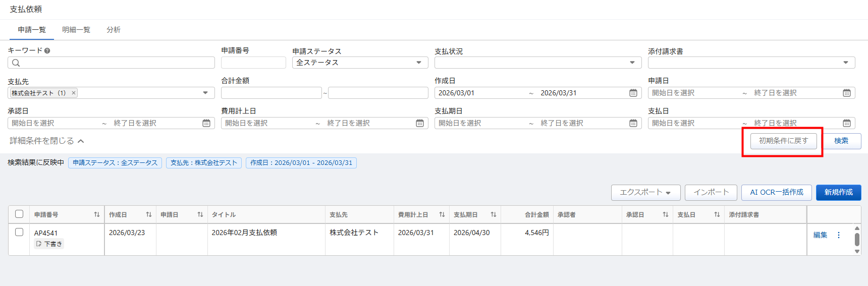 「初期条件に戻す」ボタンをクリックすると、設定した検索条件を初期値に戻すことができます。