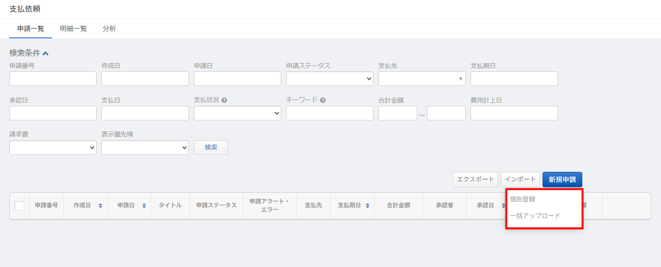 これにより、「新規作成」ボタンのクリック後に登録方法を選択する手間がなくなり、直感的に支払依頼を新規作成できるようになります。
