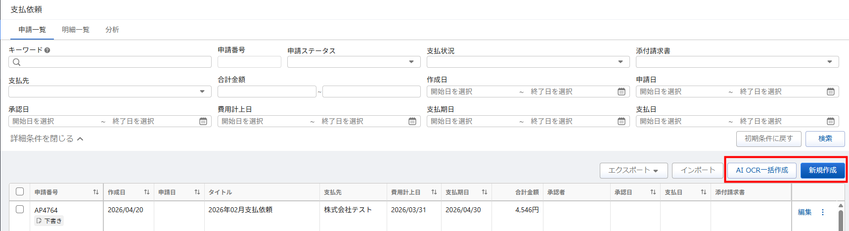 本リニューアルにより、「新規作成」ボタンから「AI OCR一括作成」ボタンを分離します。