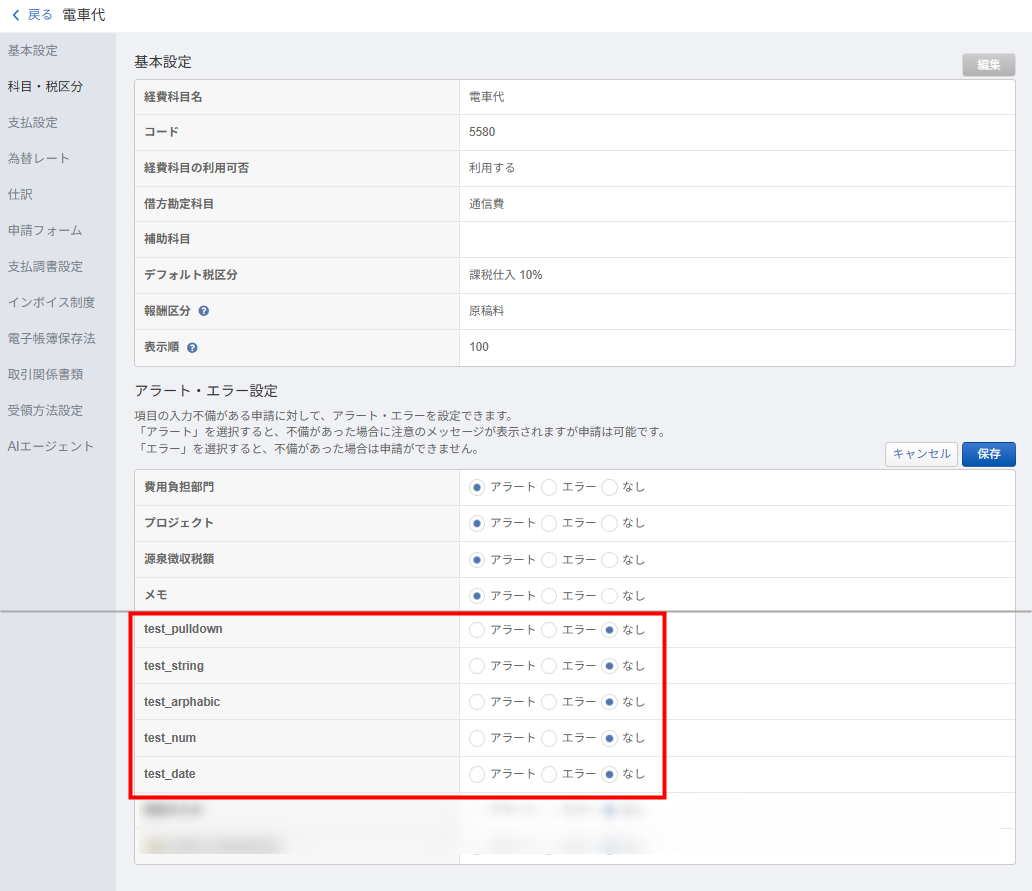 経費科目の詳細画面にある「アラート・エラー設定」において、支払明細カスタム項目に関するアラートやエラーを設定できるようになりました。