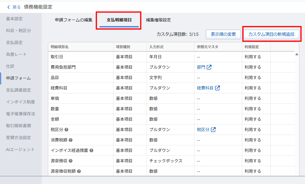「支払明細カスタム項目」タブ内に「カスタム項目の新規追加」ボタンを追加