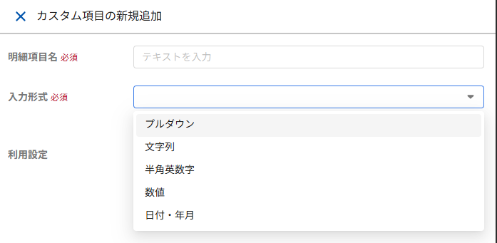 「カスタム項目の新規追加」ボタンをクリックすると表示される「明細項目の新規追加」画面では、「プルダウン」や「文字列」等の任意の表示形式で支払明細項目を追加できます。