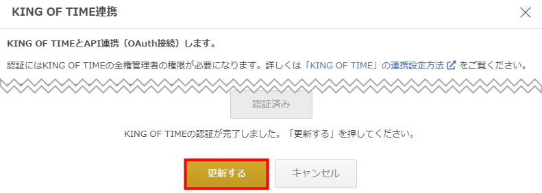 - 「KING OF TIME連携」画面で「更新する」をクリックします。