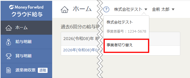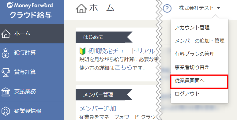 サービス画面右上の事業者名をクリックして「従業員画面へ」を選択すると、給与担当者用画面から従業員用画面に切り替えられます。
