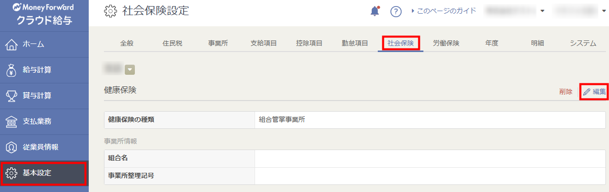 1. 「基本設定」>「社会保険設定」画面の「健康保険」で「編集」をクリックします。