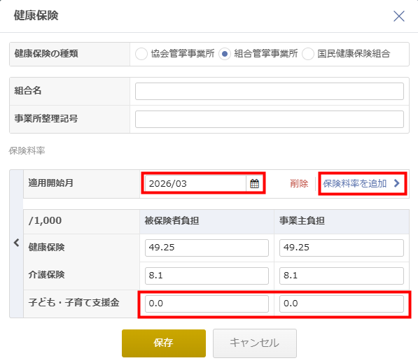 • 社会保険料の種類が「組合管掌事業所」で、子ども・子育て支援金の保険料率が2026年3月以前の適用開始月で設定している場合