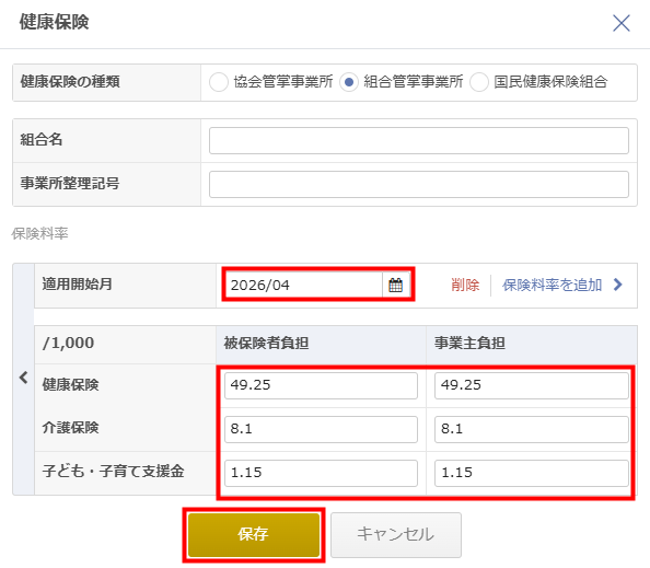 3. 「適用開始月」を「2026/04」と設定し、各保険料率を入力して「保存」をクリックします。