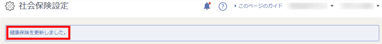 4. 「社会保険設定」画面上部に「健康保険を更新しました。」と表示されたことを確認します。