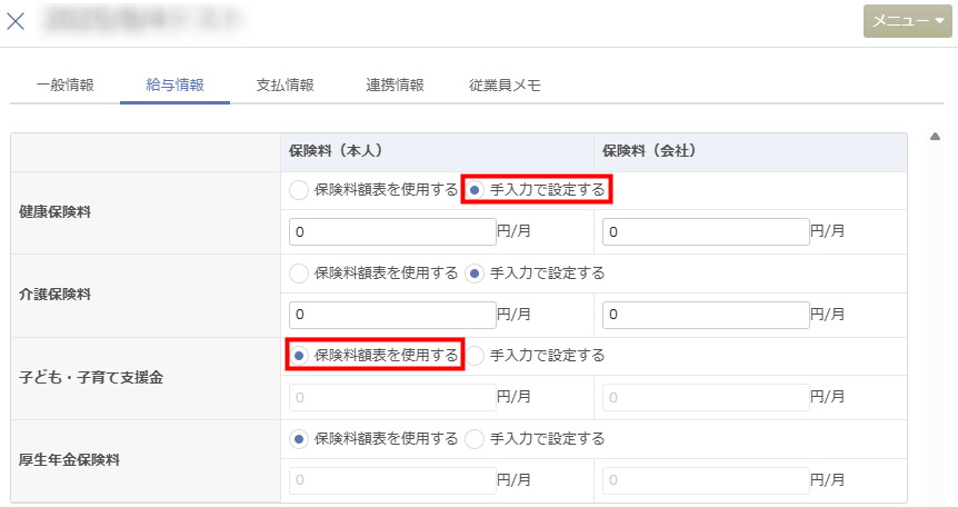 • 「従業員情報」>「給与情報」画面で、健康保険料を「手入力で設定する」かつ、子ども・子育て支援金を「保険料額表を使用する」に設定している場合