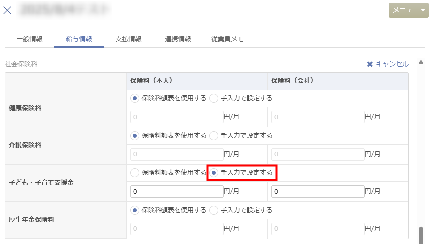 • 「従業員情報」>「給与情報」画面で、子ども・子育て支援金を「手入力で設定する」に設定している場合