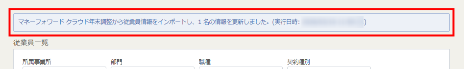 - 「マネーフォワード クラウド年末調整から従業員情報をインポートし、●●名の情報を更新しました。」というメッセージが表示されたことを確認します。