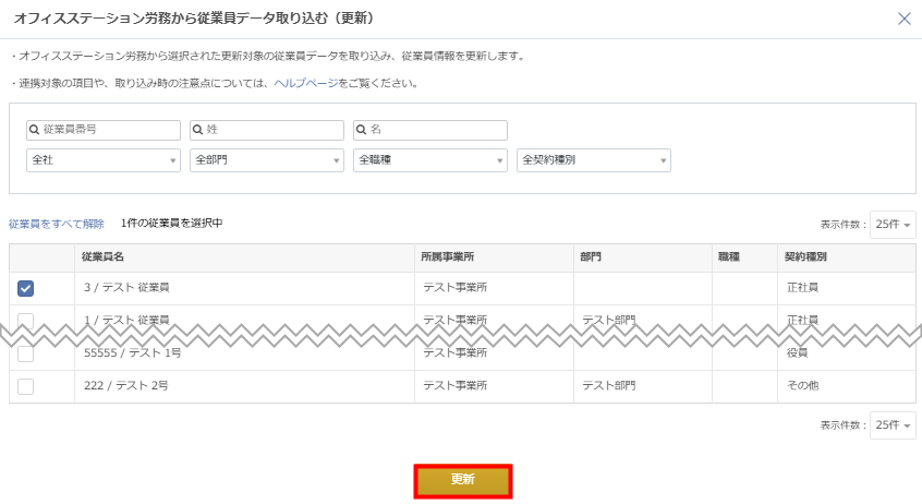 更新する従業員が表示されない場合は、「オフィスステーションから従業員データを取り込み(新規)」を行ってから更新してください。