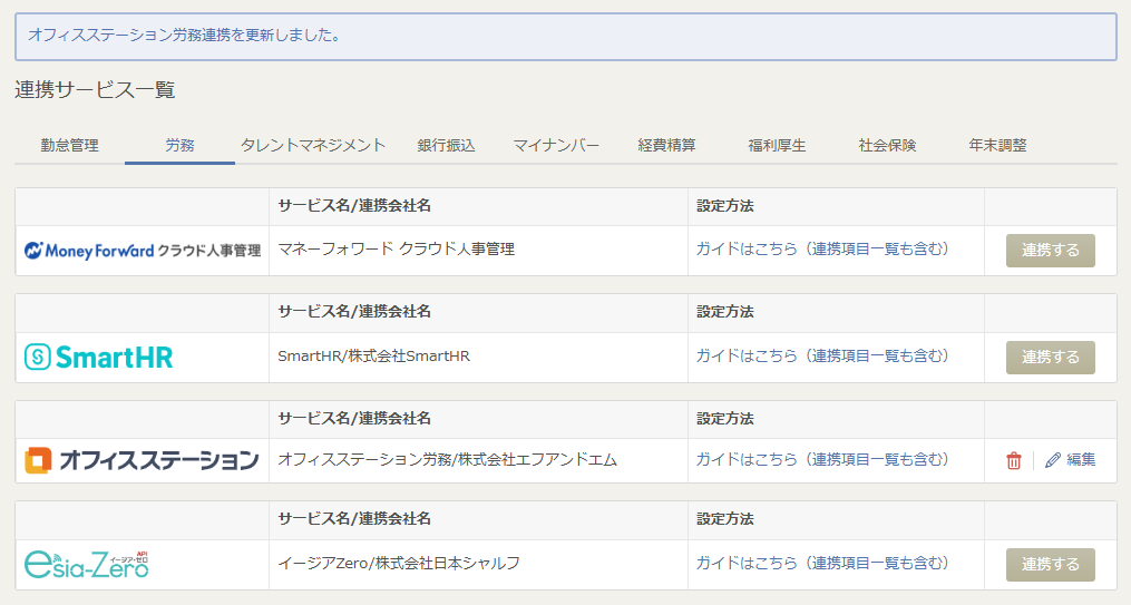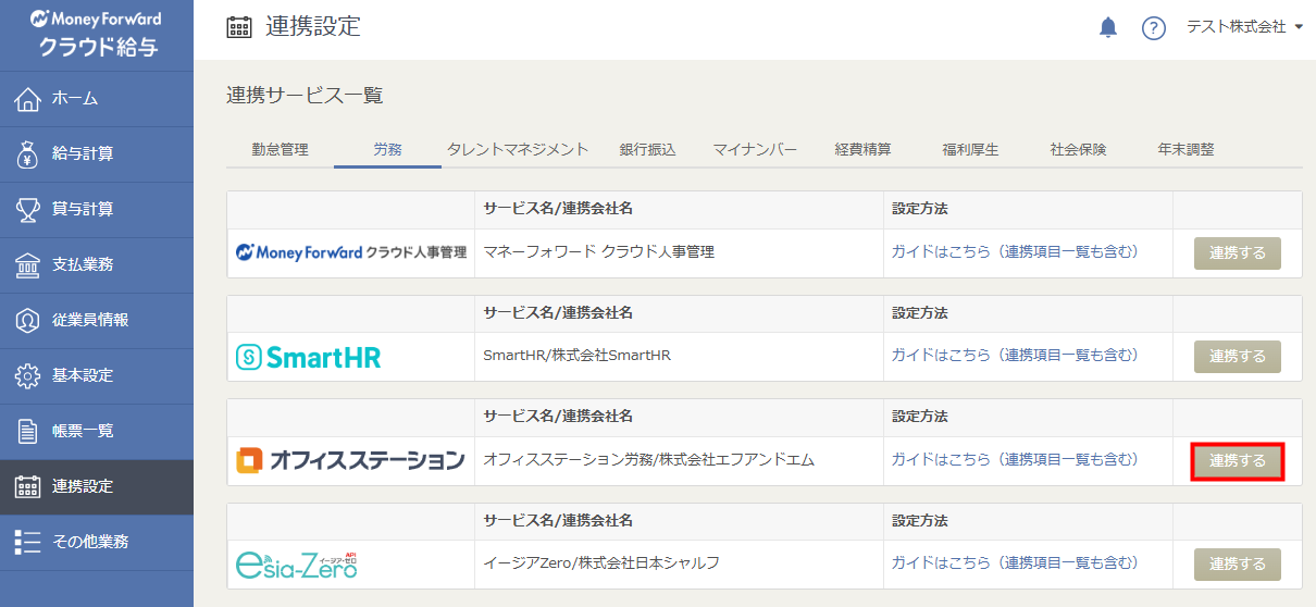 - 「連携設定」画面で「労務」タブを選択し、「オフィスステーション労務」の「連携する」をクリックします。