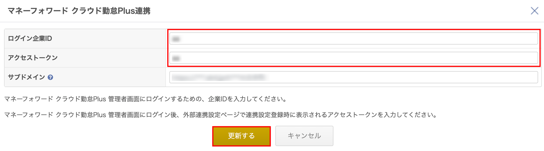 「マネーフォワード クラウド勤怠Plus連携」画面で「ログイン企業ID」と「アクセストークン」を編集し、「更新する」をクリックしてください。