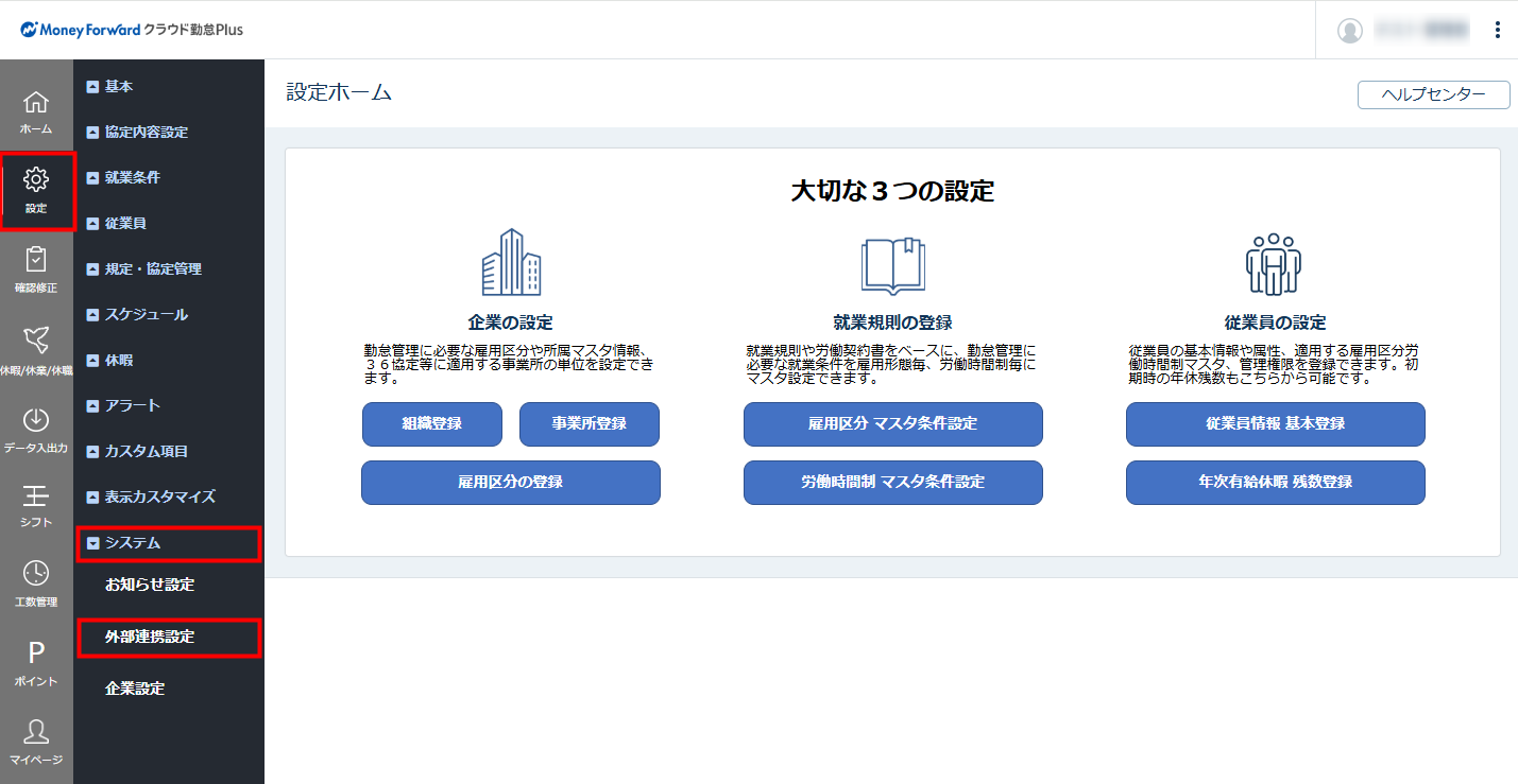 - 「マネーフォワード クラウド勤怠Plus」にログインして「設定」をクリックし、「システム」の「外部連携設定」を選択します。