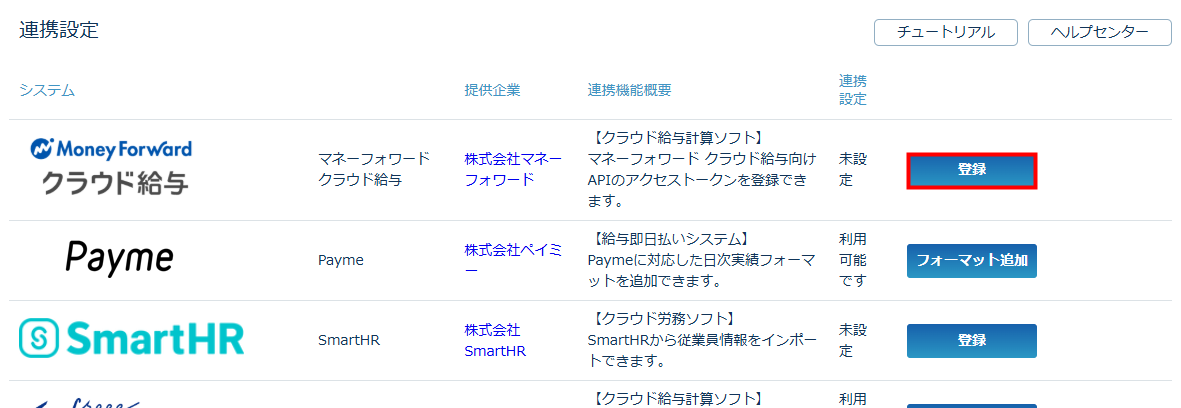 - 「連携設定」画面で「マネーフォワード クラウド給与」の「登録」をクリックします。