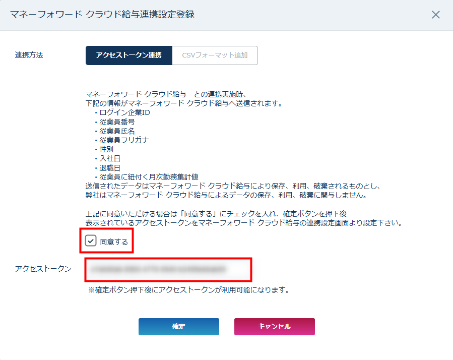 - 「マネーフォワード クラウド給与連携設定登録」画面を確認し、問題がなければ「同意する」にチェックを入れてアクセストークンをコピーします。