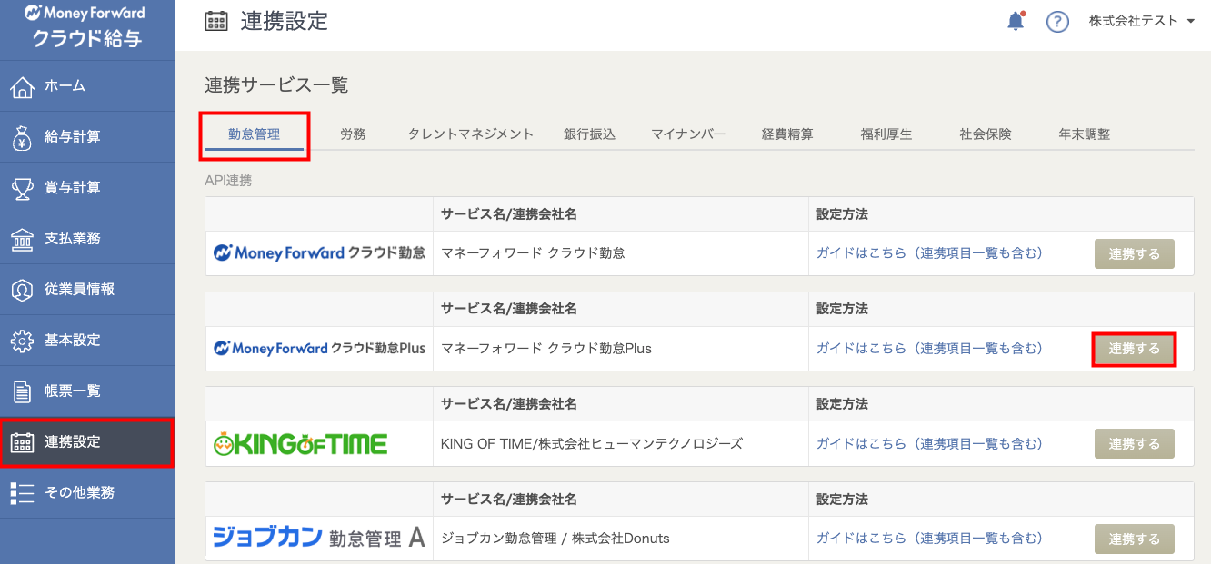 - クラウド給与の「連携設定」>「勤怠管理」画面を開き、「マネーフォワード クラウド勤怠Plus」の「連携する」をクリックします。