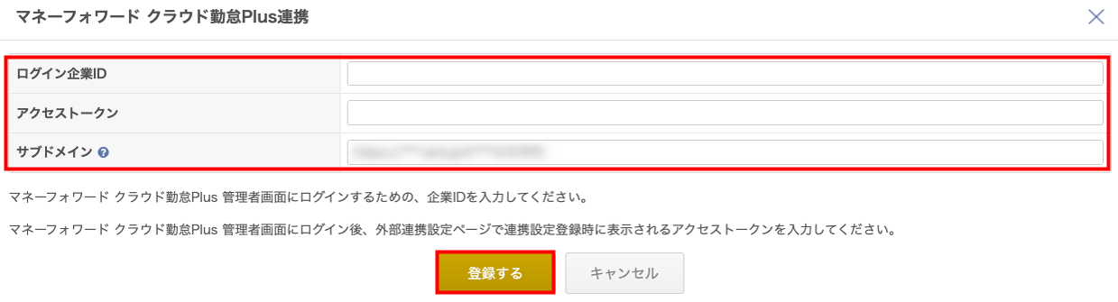 - 「「マネーフォワード クラウド勤怠Plus連携」画面で「ログイン企業ID」「アクセストークン」「サブドメイン」を入力し、「登録する」をクリックします。