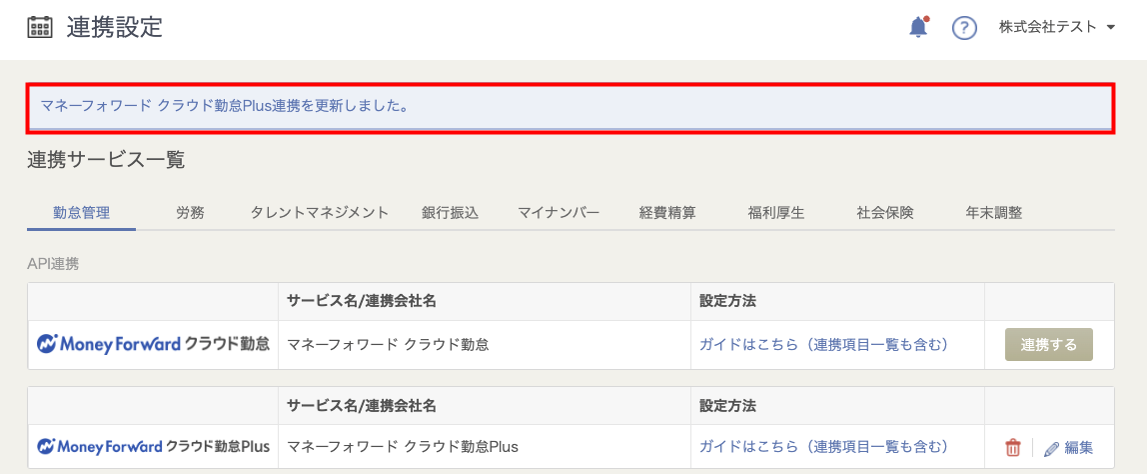 - 画面上部に「マネーフォワード クラウド勤怠Plus連携を更新しました。」というメッセージが表示されたことを確認します。