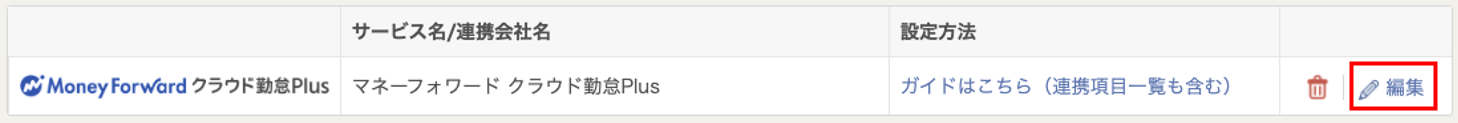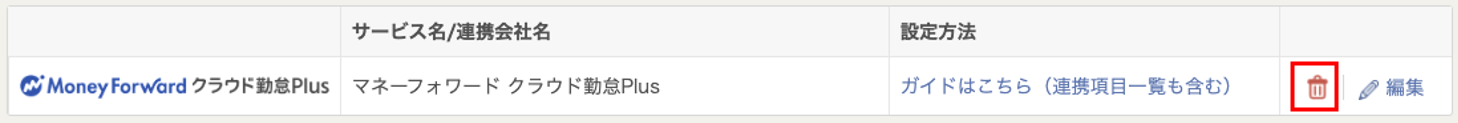 「マネーフォワード クラウド勤怠Plus」の右側にあるゴミ箱のアイコンをクリックすると、連携を解除できます。