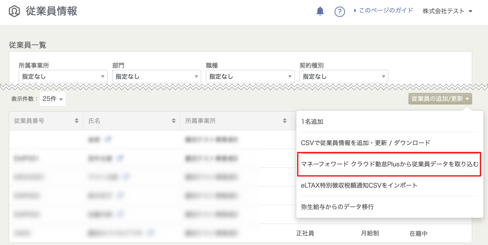 - 「従業員情報」画面で「従業員の追加/更新」をクリックし、「マネーフォワード クラウド勤怠Plusから従業員データを取り込む」を選択します。