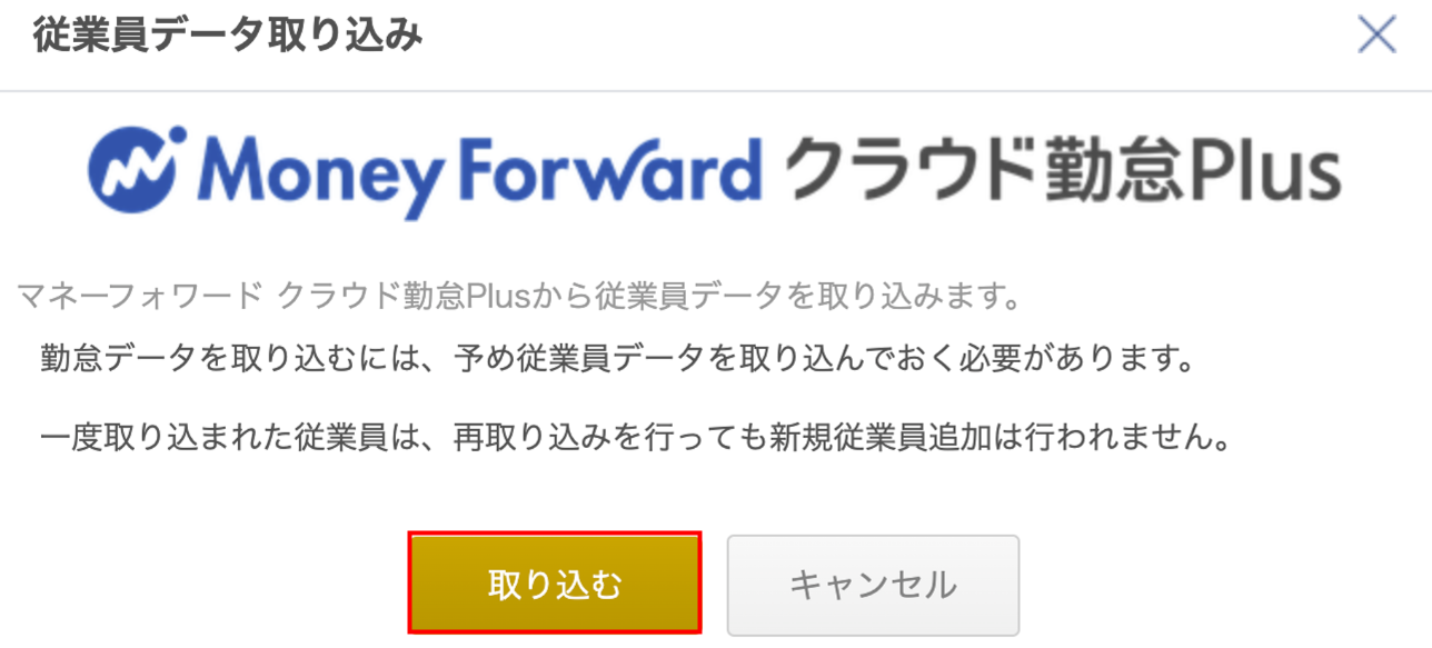 - 「従業員データ取り込み」画面で注意事項を確認し、「取り込む」をクリックします。