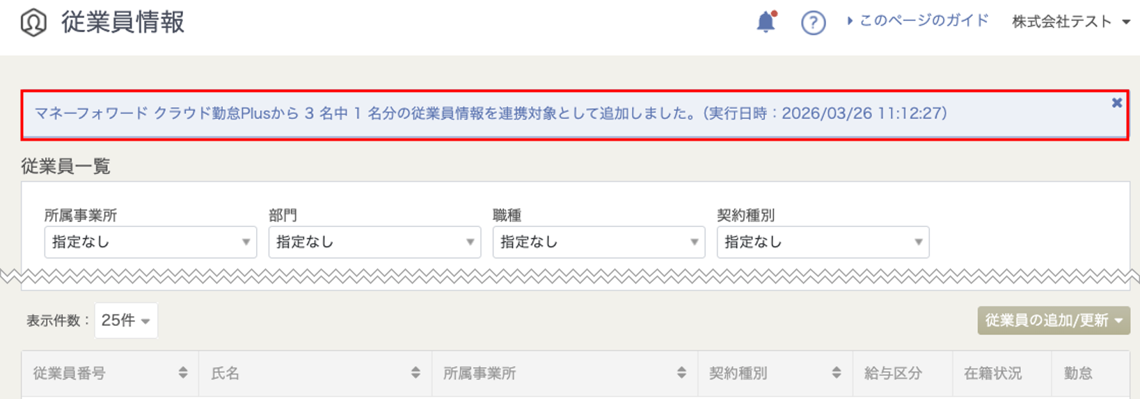 - 「マネーフォワード クラウド勤怠Plusから●名中●名分の従業員情報を連携対象として追加しました。」というメッセージが表示されたことを確認します。