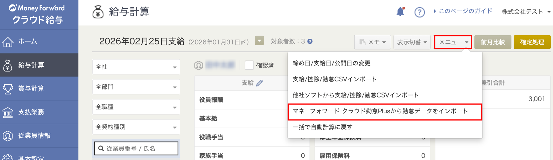 - 「給与計算」画面右上の「メニュー」をクリックし、「マネーフォワード クラウド勤怠Plusから勤怠データをインポート」を選択します。