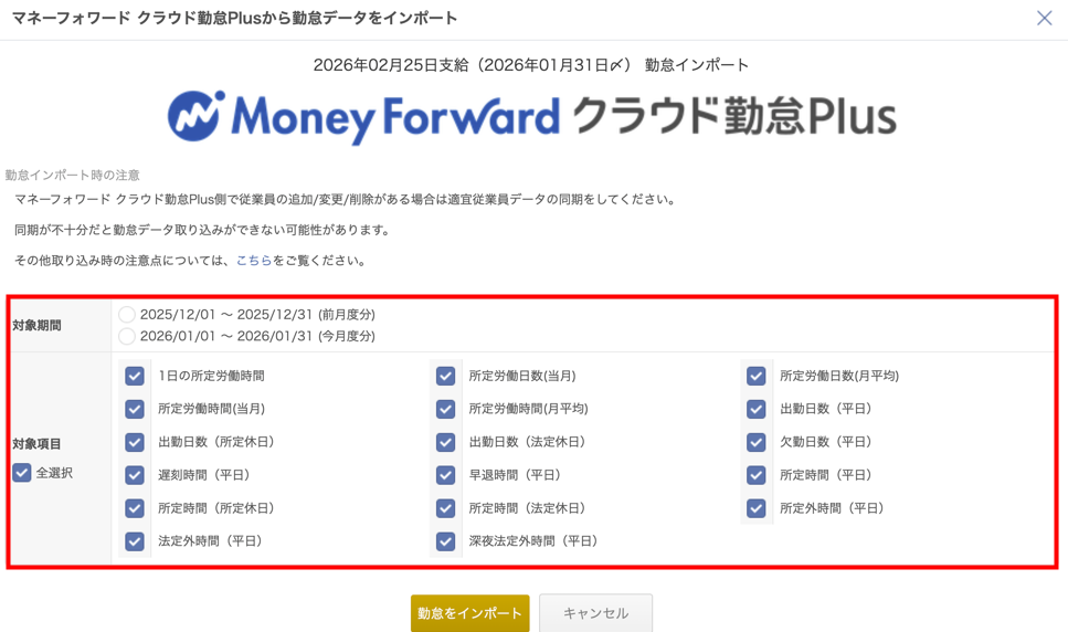 - 「マネーフォワード クラウド勤怠Plusから勤怠データをインポート」画面で「対象期間」と「対象項目」を選択します。