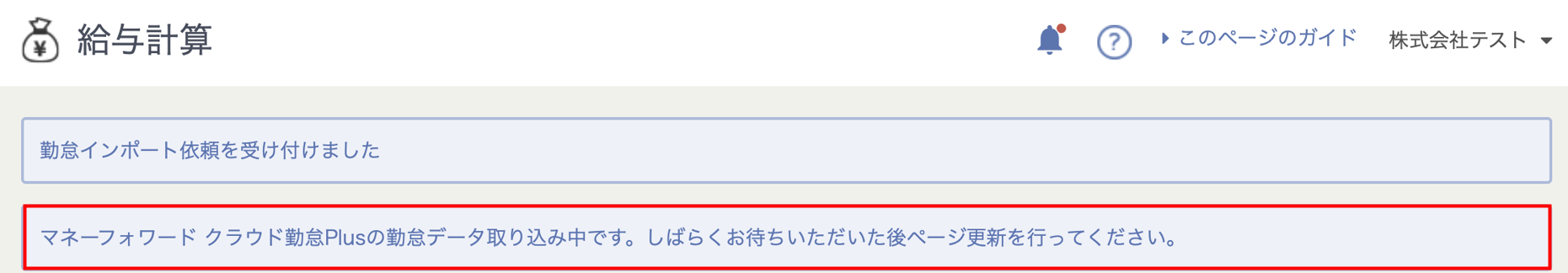 - 「マネーフォワード クラウド勤怠Plusの勤怠データ取り込み中です。しばらくお待ちいただいた後ページ更新を行ってください。」というメッセージが表示されます。