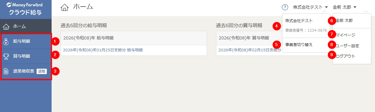 | ⑤ | 事業者切り替え | クリックすると、「事業者切り替え」画面でログインする事業者を切り替えられます。 事業者を切り替えると、各事業者で発行された給与明細を確認できます。 |
