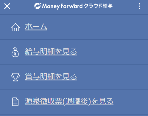 サービス画面左上の「≡」アイコンをクリックすると、給与明細・賞与明細・退職者の源泉徴収票が確認できるメニューが表示されます。