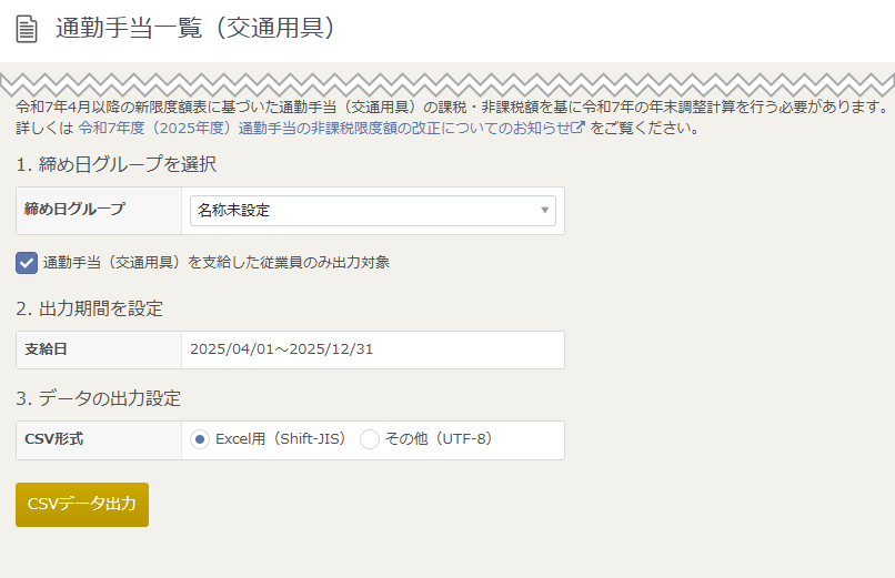| 通勤手当(交通用具)の金額を確認する帳票 | 給与計算・賞与計算の確定時に自動反映 | 確定済みの給与の通勤手当/課税支給、通勤手当/非課税の金額や支給日 |