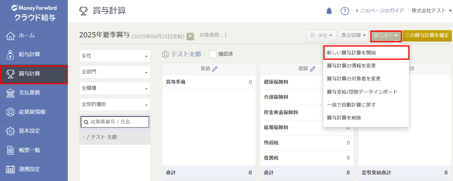 - 2回目以降の賞与計算を作成する場合は、手順1で「賞与計算」画面の「メニュー」をクリックし、「新しい賞与計算を開始」を選択してください。