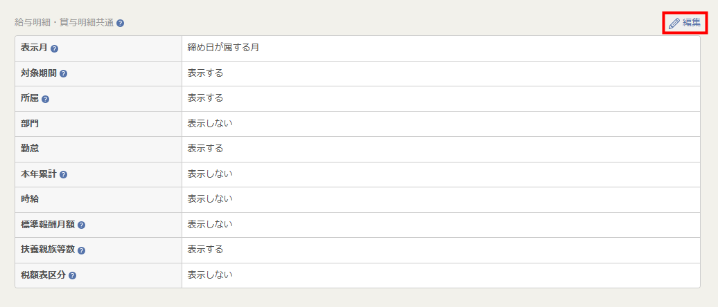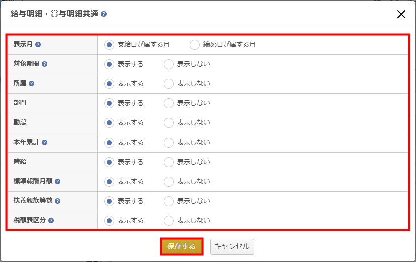 - 「表示する」に変更した場合、対象の給与・賞与計算が確定した時点の情報が明細に反映します。
