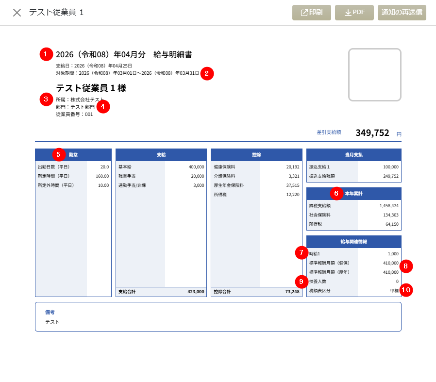 「給与明細・賞与明細共通」で設定した各項目は、給与明細・賞与明細上で以下のように表示されます。
