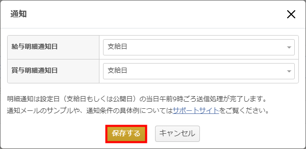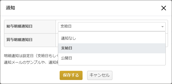 「通知」では、給与明細や賞与明細の公開時に従業員にメール通知を送信するかどうかを設定できます。