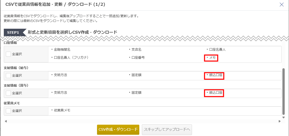 「CSVで従業員情報を追加・更新 / ダウンロード (1/2)」画面でダウンロードできるCSVファイルから「口座名」を削除し、「メモ」を追加します。