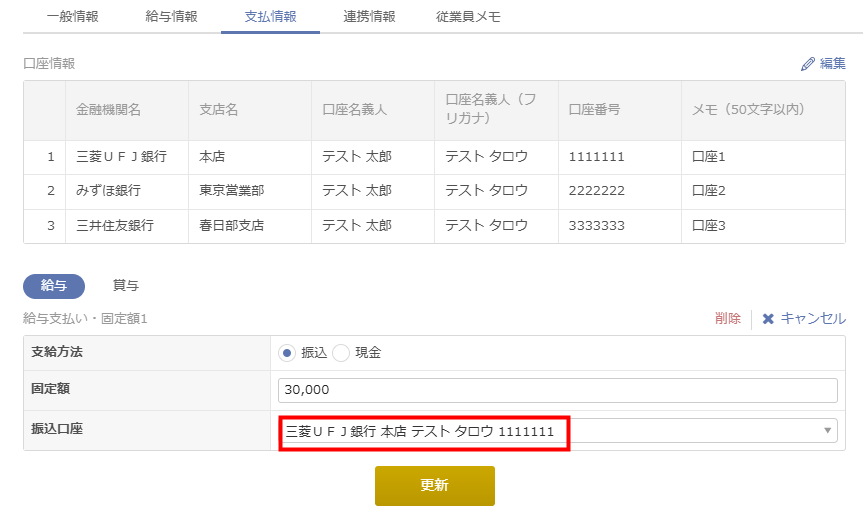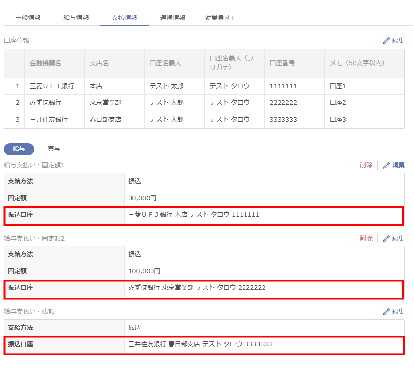 また、「給与支払い・固定額1」「給与支払い・固定額2」/「賞与支払い・固定額1」「賞与支払い・固定額2」および「給与支払い・残額」/「賞与支払い・残額」の「振込口座」を設定する項目を追加します。
