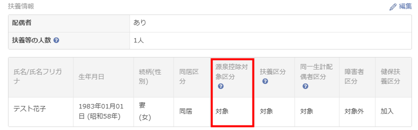 登録した方が「源泉控除対象配偶者」または「源泉控除対象親族」に該当する場合、「対象」を選択してください。