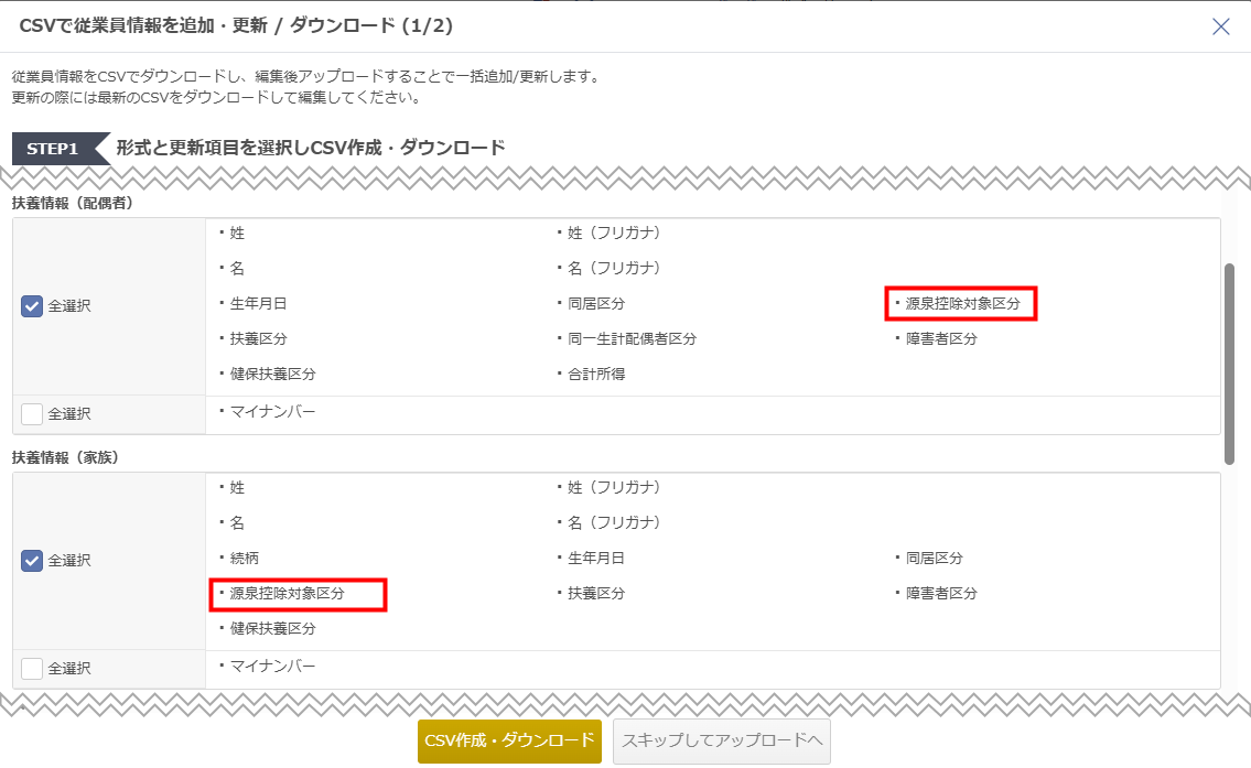 「CSVで従業員情報を追加・更新 / ダウンロード (1/2)」画面でダウンロードできるCSVファイルに「源泉控除対象区分」を追加します。