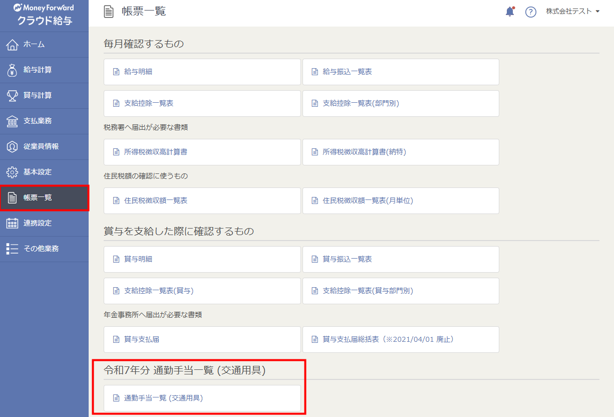 「帳票一覧」画面に「令和7年分 通勤手当一覧 (交通用具)」の項目を追加しました。