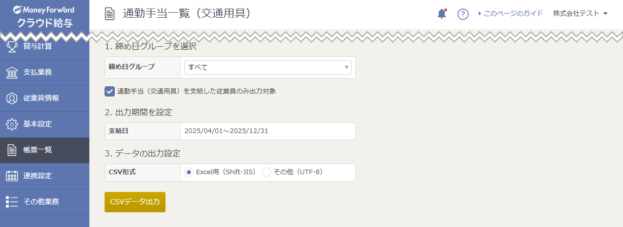 任意の締め日グループを選択して、通勤手当の情報を出力できます。改正に伴い新たに非課税となる通勤手当の金額の差額の計算にご活用ください。