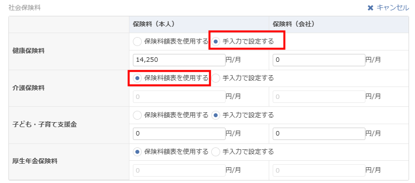 • 介護保険料の「保険料額表を使用する」の設定を「手入力で設定」とし、「健康保険料」「子ども・子育て支援金」「介護保険料」いずれも「手入力で設定」とする