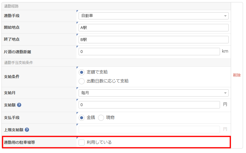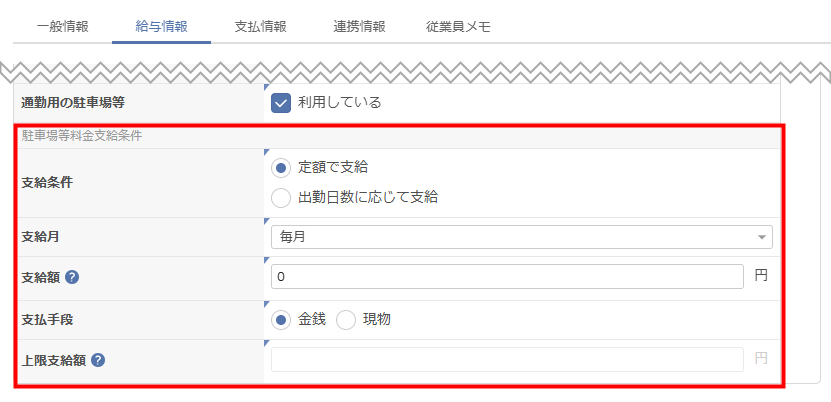 「通勤用の駐車場等」で「利用している」を選択した場合、「駐車場等料金支給条件」を登録できるようになりました。