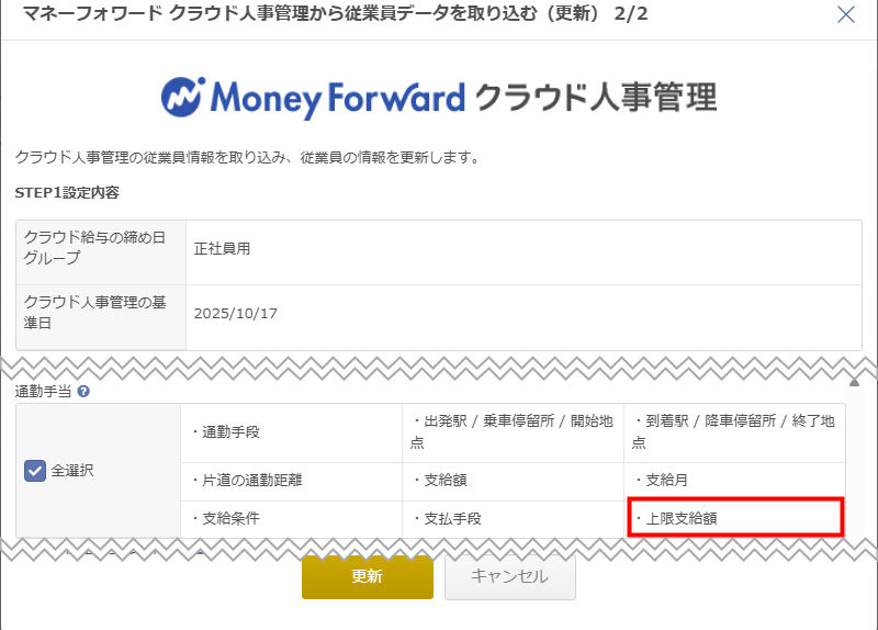 クラウド給与でのみ登録している「上限支給額」や「通勤経路」について
