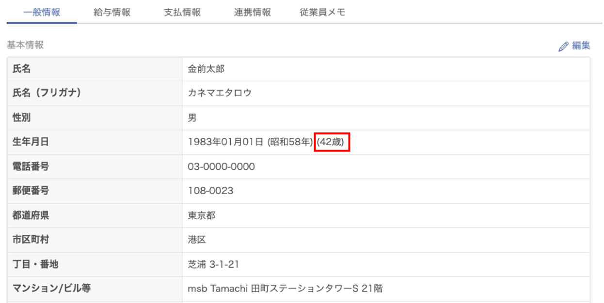「従業員情報」>「一般情報」画面の「基本情報」にある「生年月日」で年齢を確認できるようになりました。